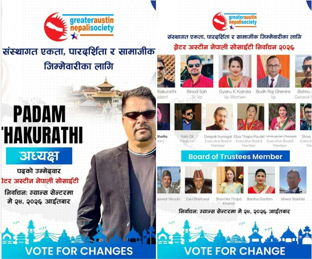 अष्टिन, टेक्सास । ग्रेटर अष्टिन नेपाली सोसायटी (GANS) को आसन्न निर्वाचनलाई लिएर समुदायभित्र मिश्रित प्रतिक्रिया उत्पन्न भएको छ। एकातिर सामाजिक अभियन्ता पदम ठकुराठीको उम्मेदवारीसँगै समाजमा एकताको आशा पलाएको चर्चा भइरहेको छ भने, अर्कोतिर अध्यक्ष पदका प्रत्यासी रामकुमार महतोले निर्वाचन समितिको निष्पक्षतामाथि गम्भीर प्रश्न उठाउँदै प्रक्रियाबाट बाहिरिने घोषणा गरेका छन्।