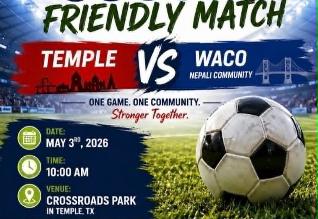 टेम्पल, टेक्सास— नेपाली सोसाइटी अफ सेन्ट्रल टेक्सासले आगामी मे ३, २०२६ मा टेम्पल र वेको क्षेत्रका नेपाली समुदायबीच एक विशेष मैत्रीपूर्ण फुटबल खेल आयोजना गर्ने भएको छ।